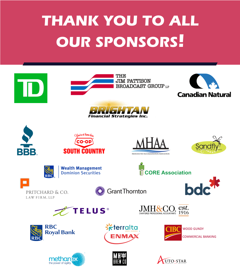 With the support of our sponsors, including Jim Pattison Broadcast Group (Ceremony Sponsor), TD Bank (Technology Sponsor), Canadian Natural Resources Limited (Entertainment Sponsor), Brightan Financial Strategies Inc. (Chamber Partner Sponsor). Methanex (Gold Sponsor), and Auto-Star Compusystems Inc. and Medicine Hat Brewing Company Inc.(Bronze Sponsors), the Chamber is proud to move forward with this community celebration!