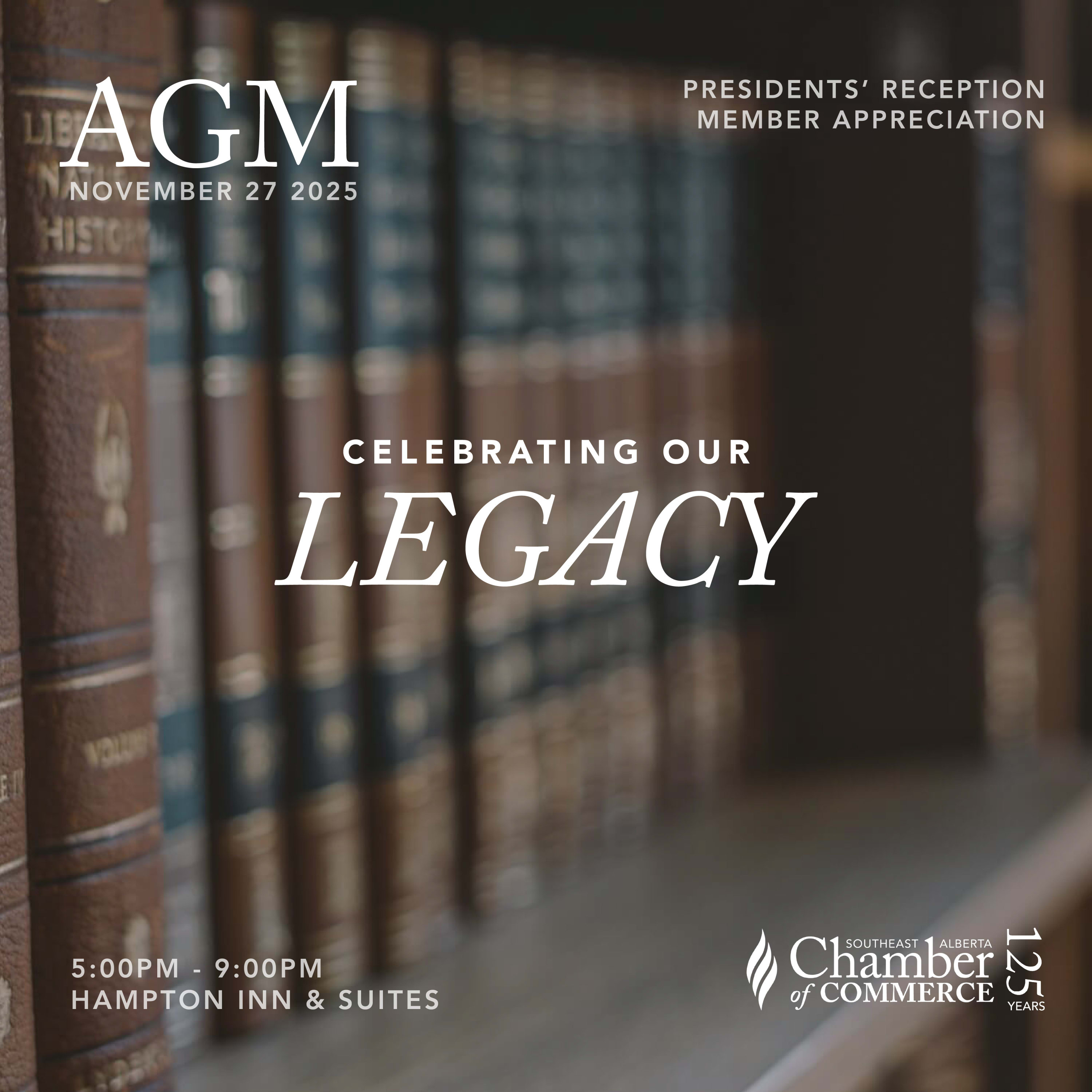 See what we've been up to in the past year all while getting a chance to eat, drink and connect with others at our Annual General Meeting and President's Reception! Join us at The Hampton Inn and Suites Medicine Hat for an opportunity to meet and network with the Chamber of Commerce members, current/ past Directors and Presidents of the Board, and the Chamber operations team.