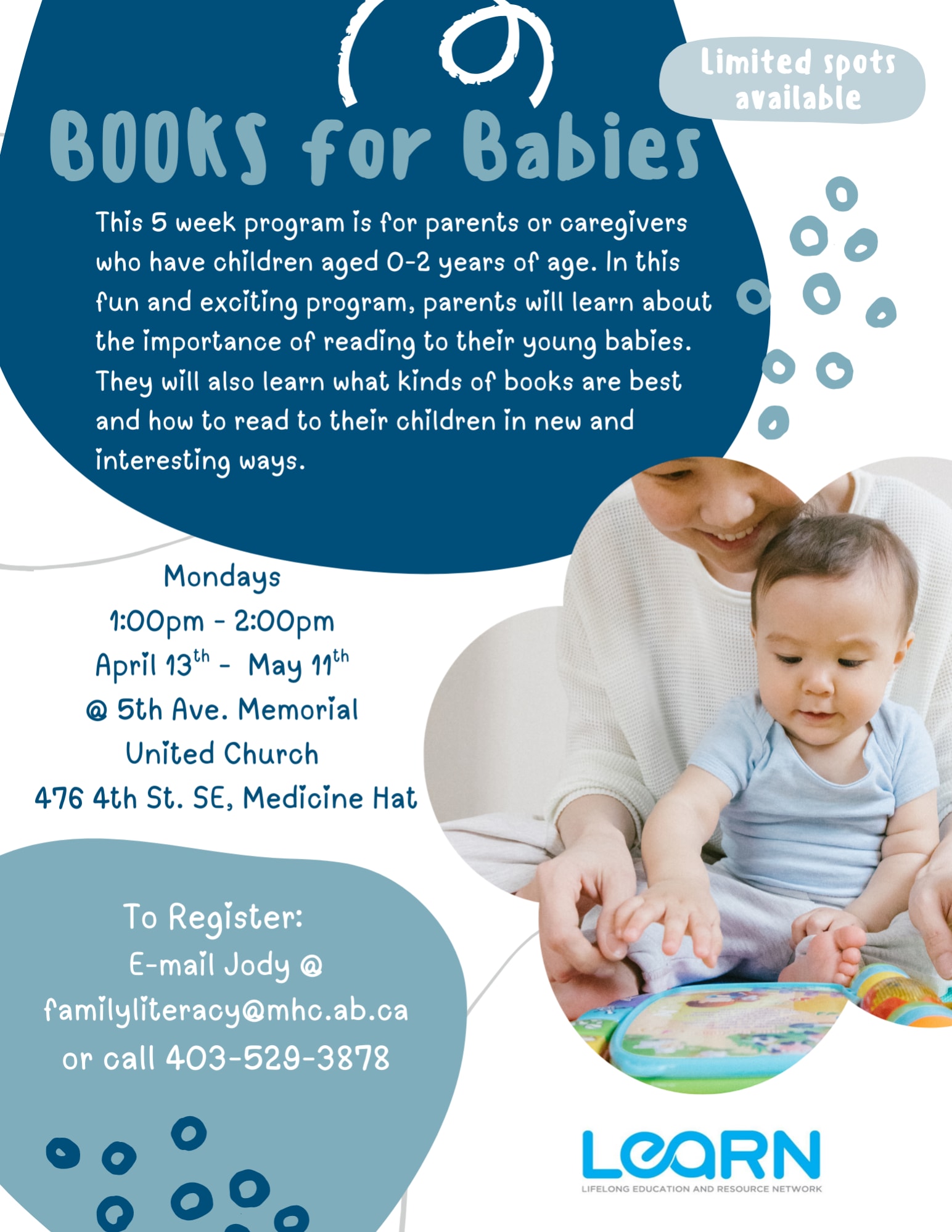 This 5 week program is for parents and caregivers who have children aged 0-2 years of age. In this fun and exciting program, parents will learn about the importance of reading to their young babies. They will also learn what kinds of books are best and how to read to their children in new and interesting ways.