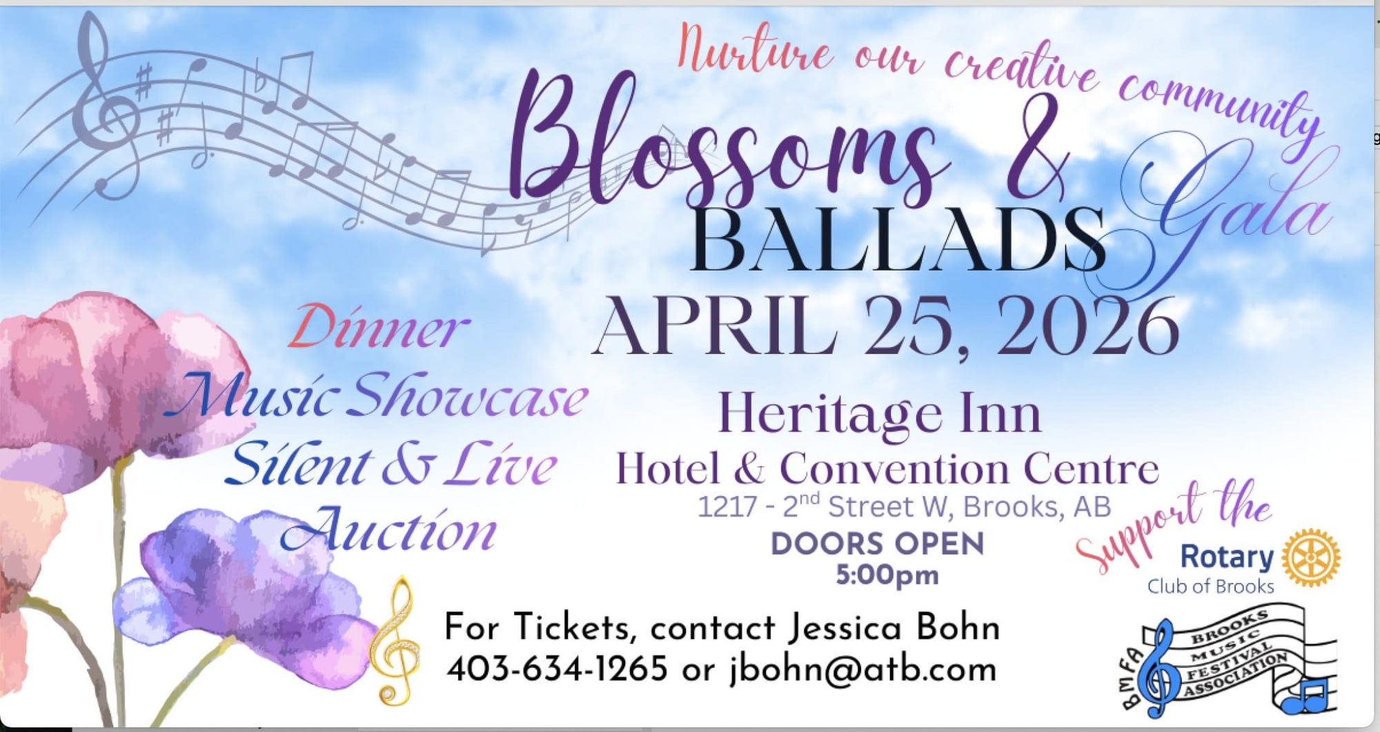 The evening will feature dinner, live music, showcases, and a silent auction. This gala is a community fundraiser, supporting the endeavours of both the Brooks Music Festival Association and the Brooks Rotary Club.
