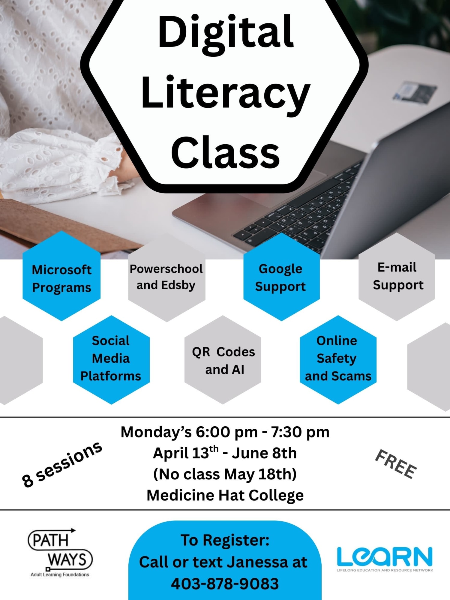 8 sessions will focus on Microsoft Programs, Google Support, E-mail support, social media platforms, and online safety and scams. In partnership with MHC and Pathways.