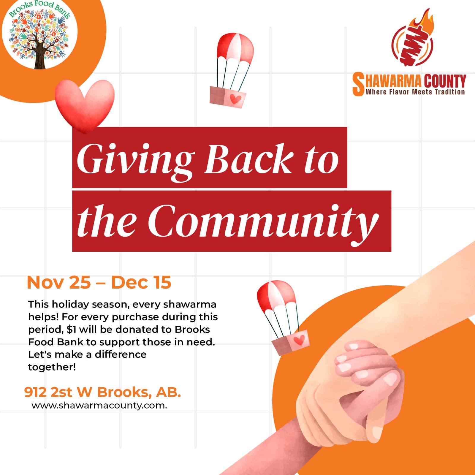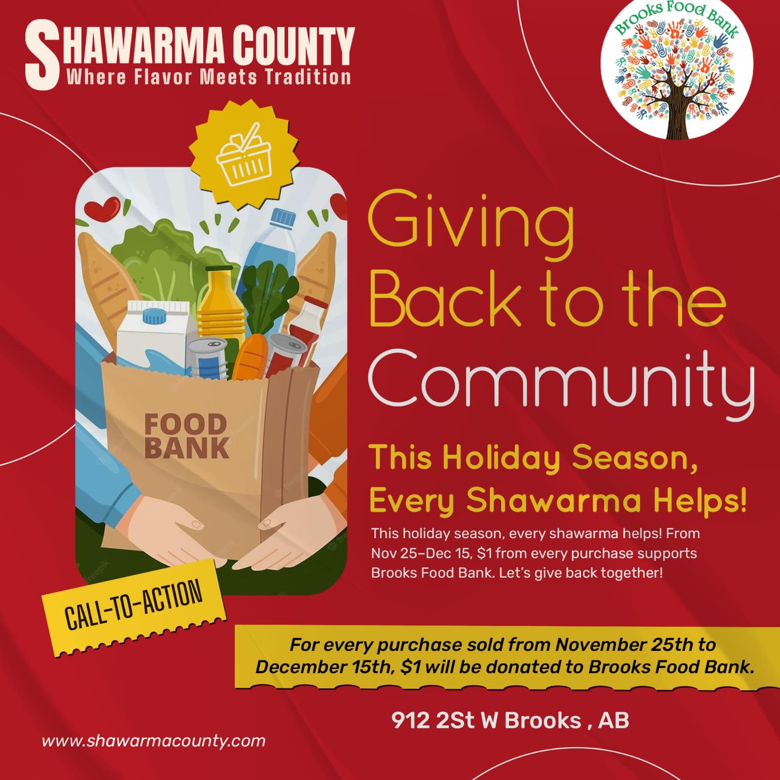 This holiday season, every Shawarma helps! between November 25th and December 15th, $1 from every purchase will be donated to the Brooks Food Bank to support those in need.