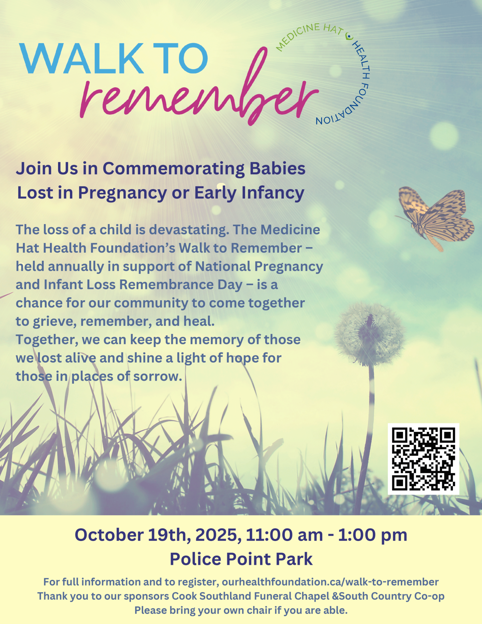 The Medicine Hat Health Foundation welcomes you to join us for our annual Walk to Remember in support of National Pregnancy and Infant Loss Remembrance Day.